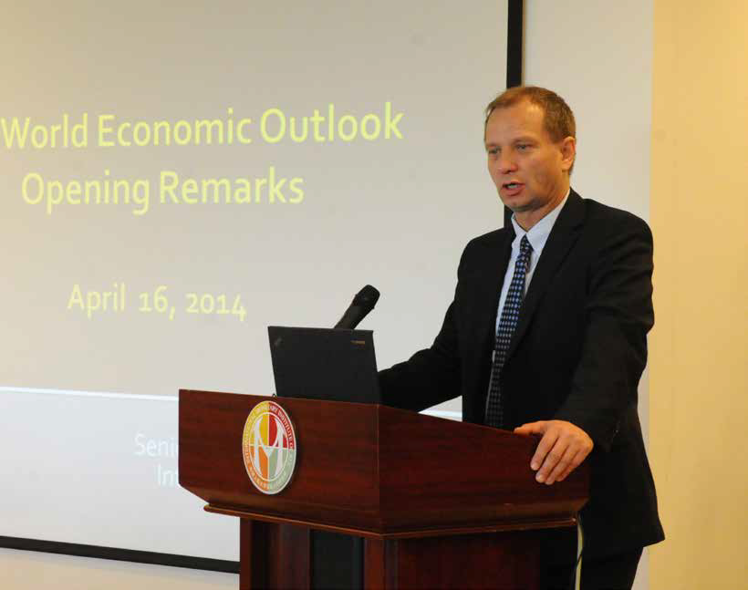 图为2014年10月23日,国际货币基金组织(IMF)驻华首席代表Alfred Schipke在《世界经济展望报告》发布会上做主旨演讲