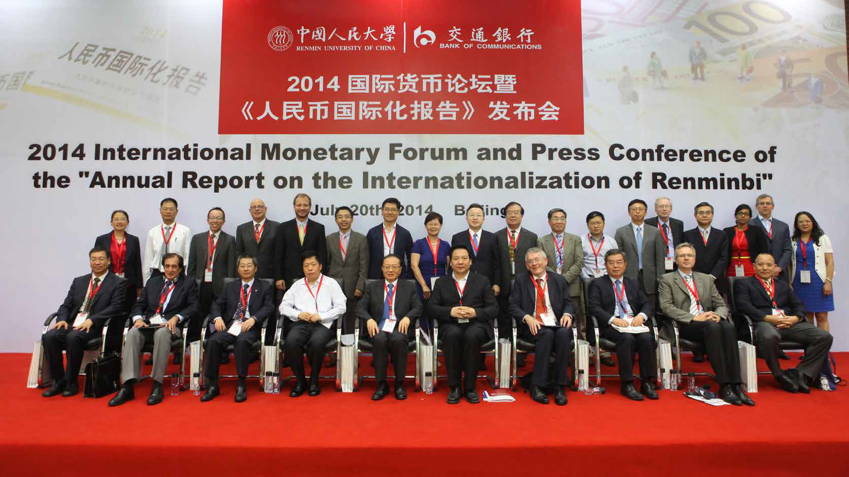 2014年7月20日,中国人民大学与交通银行联合举办“2014国际货币论坛暨《人民币国际化报告》发布会”,国际货币研究所(IMI)与国际货币金融机构官方论坛(OMFIF)、德国法兰克福大学(歌德大学)、韩国对外经济政策研究院(KIEP)、香港经纶国际经济研究院共同承办。论坛以纪念布雷顿森林体系建立70周年为契机,深入探讨了国际货币体系改革的历史与未来以及人民币离岸市场建设与发展等议题。中国人民大学校长、《人民币国际化报告2014》主编陈雨露,商务部原副部长魏建国,中国社会科学院副院长李扬,国务院研究室副主任韩文秀,交通银行副行长钱文挥,中国人民大学常务副校长王利明,摩根大通亚太监管战略主管、国际货币基金组织(IMF)原亚太部门主管Anoop Singh,国际货币金融机构官方论坛(OMFIF)联席主席David Marsh,卢森堡大学校长Rainer Klump以及国际货币基金组织(IMF)驻华首席代表Alfred Schipke等国内外顶尖专家和政策领导人,以及来自欧、美、亚等地区科研院所、政府部门和金融机构的50余位著名专家学者出席论坛并发表演讲。40多家媒体对会议高度关注,并作了专业、深度报道。论坛取得圆满成功,并对研究所深入拓展人民币国际化等货币金融领域的研究产生重要影响。
