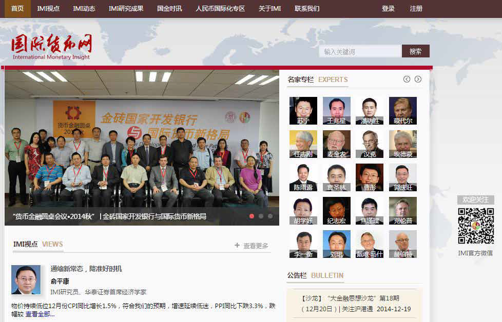 目前,IMI已经初步形成“3+1”的媒体宣传平台。《IMI简报》是IMI主编的工作汇编季刊,每季度首日出刊。《IMI简报》及时呈现每季度IMI重要工作内容,包括学术研究、合作交流、人才培养等。IMI官方网站、微博、微信三大信息平台每日向大众实时发送最新研究成果及国际金融相关热点文章,及时分享IMI及著名金融行业专家的观点与声音。IMI官方网站“国际货币网”的网址为:www.imi.ruc.edu.cn,开设栏目包括IMI视点、IMI动态、IMI研究成果、国金时讯、IMI公告、媒体IMI、人民币国际化专区等。IMI官方微博的网址为:http://weibo.com/imiruc,微博关注量130 ,粉丝量20751,目前共发布微博630篇。《IMI财经观察》微信公众平台自2013年7月19日注册至今,已经发布共551期,微信用户总数量在2014年已增长318%。IMI积极加强媒体和宣传合作。截止目前,根据百度搜索“中国人民大学国际货币研究所”词条目前已达126,000个。IMI与人民日报、China Daily、经济日报、经济观察报、第一财经日报、中国社会科学报,人民网、和讯网、新浪网、搜狐网,《中国金融》、《金融世界》、《金融博览》、《环球财经》,万德资讯等媒体机构展开全方位多层次合作。2014年,IMI与国研网、新华社中国金融信息网、《金融博览》杂志签署了合作框架协议,并分别在新华社中国金融信息网人民币频道、国研网金融版开设了IMI专题页面。
