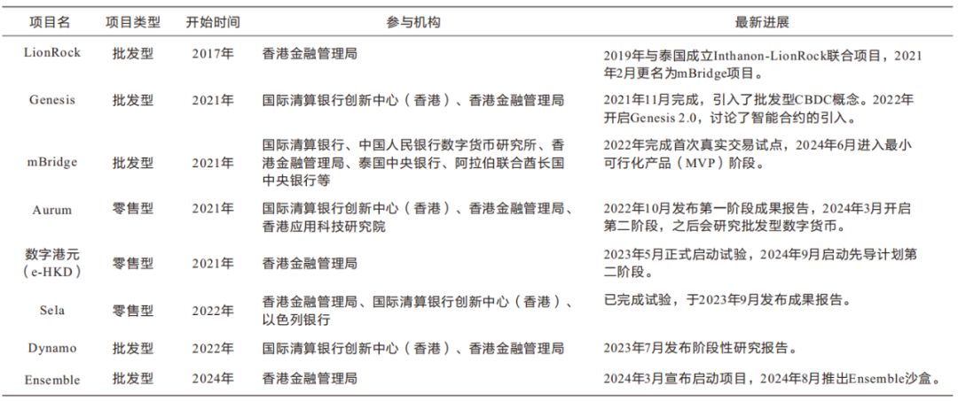 截至2025年6月,香港已至少开展或参与了8个央行数字货币相关项目,其中批发型项目5项,零售型项目3项(详见表1)。多元化项目试验使香港较为全面地研究了央行数字货币的基础设计和产品生态,并在跨地区跨币种交易方面进行了初步探索。