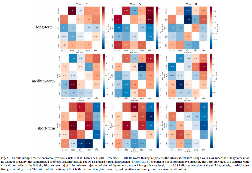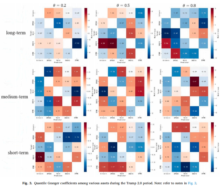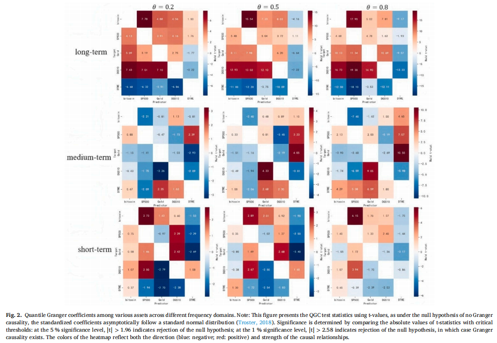 基于频域联通性分解与分位数 Granger 因果检验(QGC)的实证结果表明,在特朗普2.0之前,比特币与黄金在标普500下跌期间表现出高度相似的特征:二者在中期危机中均呈现反向波动,验证了其避险属性。然而,它们的风险对冲机制存在本质差异——比特币依赖于市场隔离效应,而黄金则依托其内在价值与价值储藏功能。特朗普2.0时期的政策转向从根本上改变了比特币的市场行为,其与标普500及美国国债收益率的相关性显著上升,削弱了其与黄金之间的相似性。此时,比特币更接近一种主流风险资产,主要用于分散化投资而非传统意义上的避险工具。上述发现与Diniz-Maganini et al. (2021)、Enilov and Mishra (2023)、Jia et al. (2023)、Pastén-Henríquez et al. (2025)、Shahzad et al. (2019) 以及 Wang et al. (2025)的研究结论相互补充并相互印证。