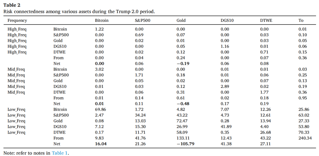 为考察特朗普2.0时代不同资产间风险传染关系的变化,本文采用2025年1月1日—2025年5月9日的样本区间。研究结果显示,特朗普2.0时期的风险传染结构发生了显著变化。表2表明,在长期维度上,风险传染程度显著上升,总体传染强度达到240.34。这意味着,在特朗普2.0时代,各类资产对政策与地缘政治冲击的敏感性显著增强,这很可能源于全球贸易紧张局势加剧以及围绕美国政策的不确定性上升,从而推高了国际金融市场的波动性。与此同时,特朗普2.0时期实施的亲加密货币政策,直接改变了众多机构投资者和交易者对比特币的态度,推动大量资金流入加密货币市场。