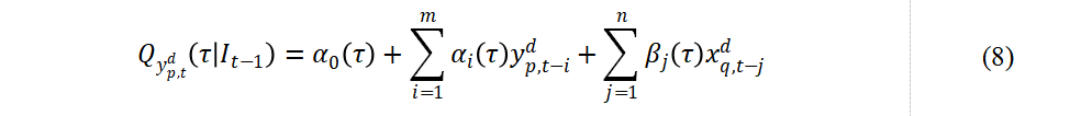 具体而言,首先对原始时间序列进行频域滤波,以提取对应频率区间内的成分。滤波过程采用零相位滤波技术,以避免相位失真。为确保与频域联通性分析方法的一致性,本文分别基于三类频率区间构建分位数 Granger 因果检验模型,其中,被解释变量表示目标资产在特定频率区间内的收益率,而解释变量表示预测资产在相同频率区间内的收益率。