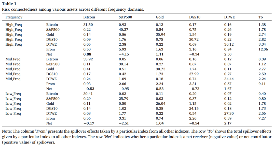 表1结果表明在全样本期(2015年3月17日—2025年5月9日)内,不同频率区间中比特币、标普500指数、黄金、美国10年期国债以及美元指数之间的风险溢出情况。根据表1中的“From”指标,从短期、中期和长期视角看,比特币在所有资产中承受的风险水平最低;相比之下,黄金的风险水平高于比特币。这表明,比特币与整体市场的联动性较低,其价格主要受自身波动影响,从而成为“分散化投资”的一种可行选择,也暗示其可能具备一定的风险对冲属性。基于表1中的“To”指标,比特币同样表现为所有资产中风险溢出程度最低的资产,而黄金则具有最高的风险溢出指数。