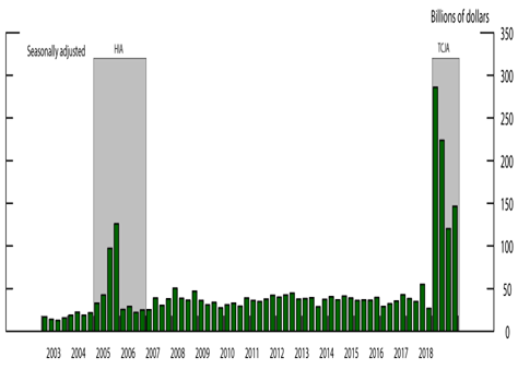 国际收支平衡表的数据显示,美国公司在2018年汇回了7770亿美元,约占2017年末离岸现金持有量估计存量的78%。遣返在2018年上半年最为强劲,被带回了5100亿美元,并在2018年全年持续增长,尽管步伐放缓(图1)。尽管放慢了脚步,但由于TCJA取消了将利润保持在国外的税收优惠措施,因此遣返流量仍可能高于TCJA生效之前的水平。作为参考对照,2004年的《本土投资法案》(HIA)实行了免税期,将遣返税率暂时降低了一年,导致2005年遣返了3120亿美元,其中约7500亿美元被保留在国外。应该注意的是,遣返反映了纯粹以会计手段向美国的资金转移:以前由外国子公司持有的资金现在由美国母公司持有。