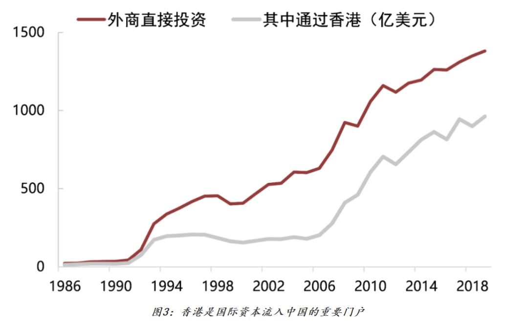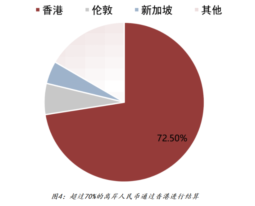 最后是美元与港币自由兑换问题。如果美国取消美元和港币的自由兑换,那么这可能是一个“三败俱伤”的情况。对于香港而言,联系汇率制会出现一定动荡,国际金融中心地位可能也将受到影响,也会有大量的国际资本流出香港;对于内地而言,香港是国际资本流入内地的重要门户(图3),也是内地企业上市融资的主要目的地之一,还是全球最大的离岸人民币业务中心(图4),若香港金融系统出现动荡,内地的FDI、人民币国际化、企业海外融资等都将受到影响;对于美国而言,一方面,目前美国在香港有1300多家企业和8.5万美国人,几乎所有的重要金融企业都在香港有分支机构,若港币与美元脱钩,对这些企业和个人的影响会非常大;另一方面,香港是以美元作为储备货币最典型的地区,其他地区的储备货币基本都是一篮子货币,因此如果港币与美元脱钩,对美元地位的影响也需纳入考量。