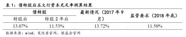 最后,我们计算债转股前后的资本充足率,并与监管要求进行比较。银行相关数据均取自9月份或2017年三季报,并静态假设转股2年内资本净额和风险资产规模均不变。