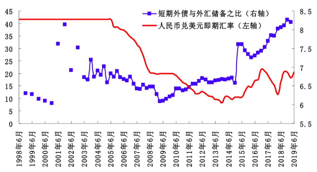 图2 人民币兑美元即期汇率与短期外债占比外汇储备