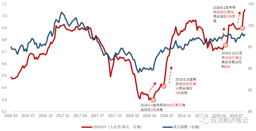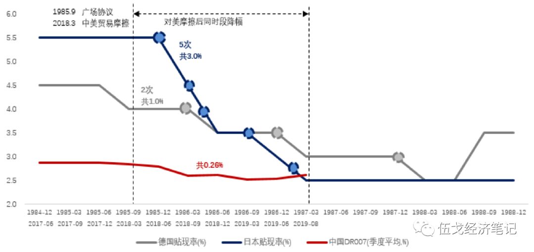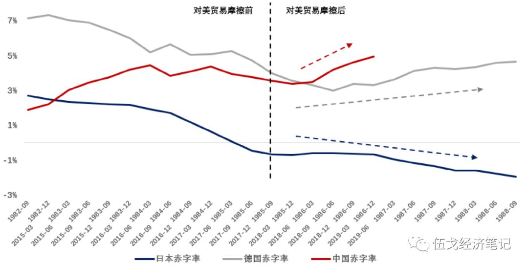 从汇率政策而言,上世纪80年代广场协议后,日德对美汇率大幅升值。而去年中美贸易摩擦开始以来,人民币对美元汇率整体呈现贬值态势。