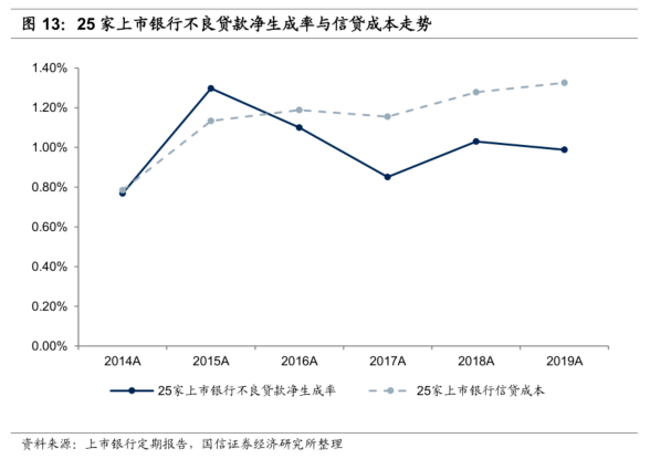 (4)不良贷款净生成率提升1BP,信贷成本提升1.3BP。2017-2019年“信贷成本/不良贷款净生成率”均值为1.31,不考虑2020年银行主动调节拨备释放利润,因为拨备的调整并不影响银行实际盈利能力。
