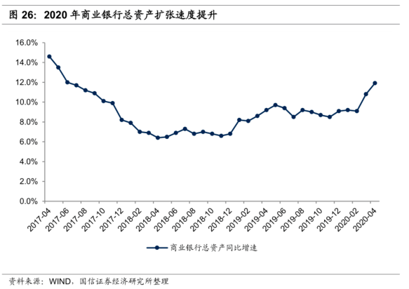 2020年4月末商业银行总资产余额同比增长11.9%,较2019年全年增速提升了2.8个百分点,银行资产扩张速度提升主要是经济下行压力加大,货币政策和财政政策都更加积极,银行加大了对公信贷投放力度。下半年随着经济逐步好转,预计政策支持力度较上半年会有所回落,但支持力度仍高于去年。基于此,我们预测2020年25家上市银行2020年总资产增速在11%附近。