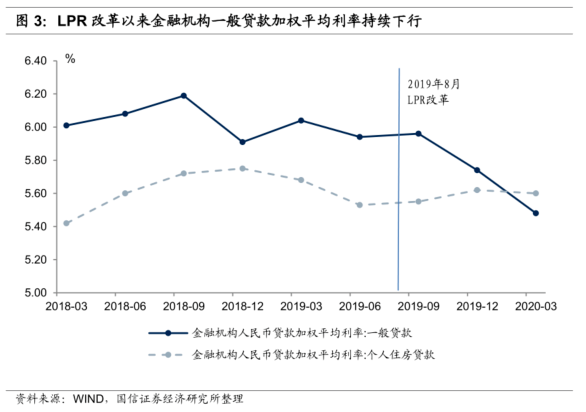 2019年8月LPR改革以来,金融机构人民币一般贷款加权平均利率持续下行,今年受疫情冲击,政策进一步引导银行加大对实体经济的让利程度,2020年3月金融机构一般贷款加权平均利率为5.48%,较2019年9月下降了48bps。银行净息差持续收窄。2020年第一季度商业银行净息差2.10%,环比2019年下降了10bps,其中大行、股份行、城商行和农商行一季度净息差分别是2.04%、2.09%、2.00%和2.44%,环比2019年分别下降了8bps、3bps、9bps和37bps。其中,农商行净息差下降幅度最大,主要是疫情冲击以来对小微企业让利政策力度最大。