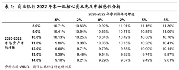 我们简单的对核心一级资本充足率做一个敏感性测算,计算未来三年在不同的净利润增速和总资产扩张速度之下我国商业银行核心一级资本充足率水平。核心假设如下: