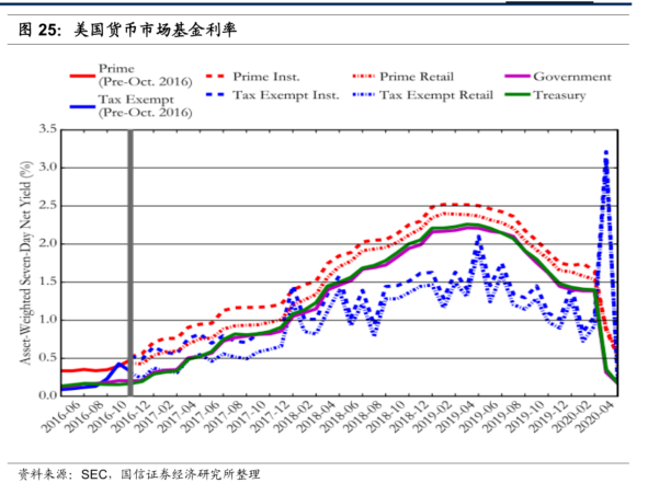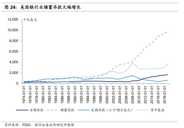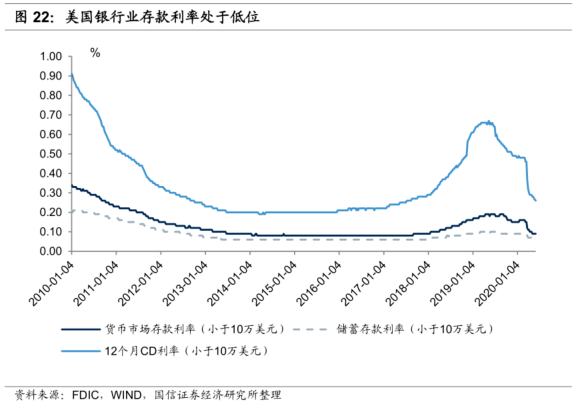 2008年金融危机后,MMF出现大规模的赎回,而MMDAs的高安全性使得其规模大幅扩张。截止2019年末,美国银行业储蓄存款账户余额9.8万亿美元(FDIC并未单独披露MMDAs规模),货币市场基金规模为3.6万亿美元。从MMDAs利率来看,MMDAs高于储蓄存款利率,低于MMF利率,且MMDAs利率走势与货币市场基金利率走势高度相关。