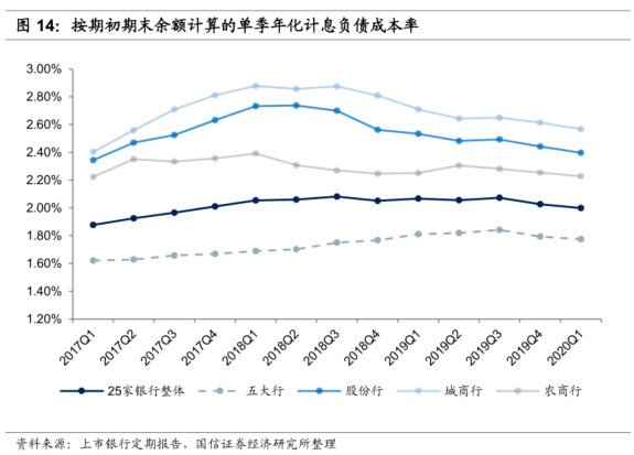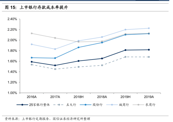 近年来存款成本持续上行的主要原因,(1)2017年以来“影子银行”迎史上最严监管,影子银行业务的压缩大幅削弱了银行存款派生能力。同时,监管要求同业负债不得超过总负债的1/3,并且将同业存款纳入同业负债监管,在流动性监管指标等计算中也给予一般存款更高的权重,因此,存款的重要性大幅提升,各家银行纷纷加大揽存力度,存款市场竞争激烈,存款成本持续提升。(2)2017年以来表外理财被严格监管,银行通过高收益的结构性存款、大额存单等来承接表外理财,避免资金和客户流失。表外理财资金回表带来商业银行存款定期化趋势日益明显,2017年末,25家上市银行活期存款占存款总额的比重为51.9%,2019年6月末降到48.8%。
