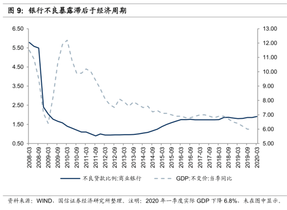银行业信用风险较经济周期具有明显的滞后性,比如2011-2013年经济增速大幅下行,但银行不良贷款率在2014-2015年才出现明显提升。受贸易摩擦冲击,我国经济增速从2018年下半年开始就已出现较大幅度的下滑,2020年受疫情冲击,一季度实际GDP下降了6.8%,预计全年经济增速较去年也会大幅下降,2018年下半年以来的经济下行周期对银行资产质量的冲击将逐步显现。尤其是此轮