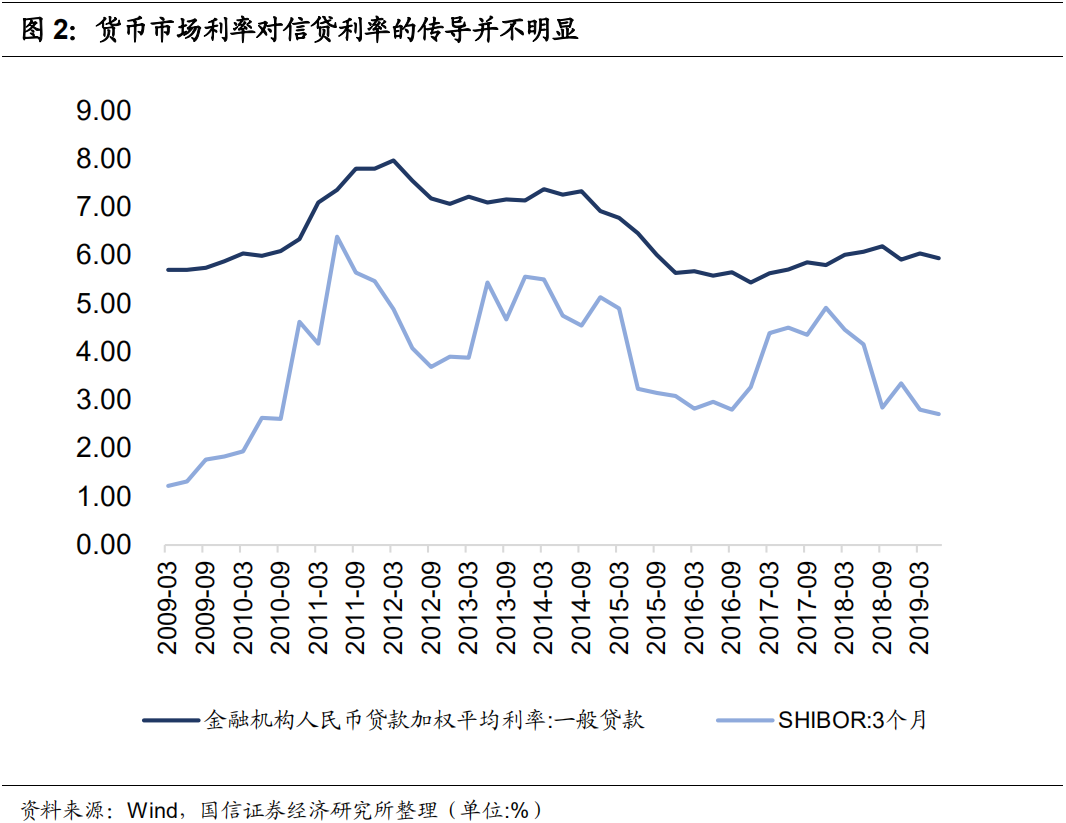 在传导通畅的环境中,需要上述四步传导都很顺畅。当然,现实中不可能存在完全无摩擦的传导,即使是市场化程度最高的国家也做不到,只是顺畅程度问题。而在我国,传导情况极不顺畅,导致目前虽然货币市场利率已经足够低,但信贷利率却下降不多。同样,在2017年前后,货币市场利率上升,信贷利率也不会跟着大幅上升。因此,信贷利率体现出一种很强的刚性,与货币市场利率之间关联性不足,以致于央行的货币政策效果被抵消一大部分。