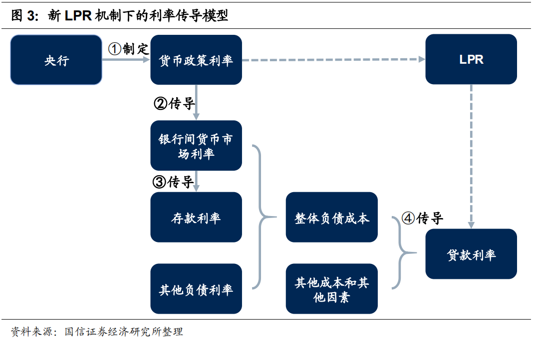 最为理想化的利率传导模型,即大致四个步骤:央行确定货币政策利率(如MLF、SLF等工具的利率)、货币政策利率影响货币市场利率(如SHIBOR等)、货币市场市场影响存款利率、银行的全部负债成本影响贷款利率。