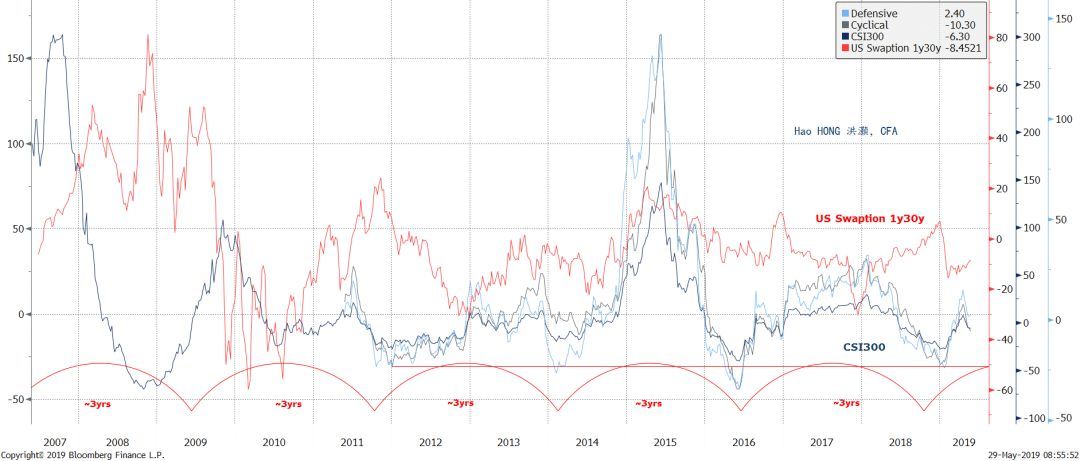 目前,掉期期权价格已经开始攀升,并且看起来将会进一步走高。与此同时,沪深300的年化收益率在2019年一月上旬触及重要底部后,在五月上旬开始回调。这种格局反映了在贸易谈判的不确定因素影响下,短期内市场将持续承压。