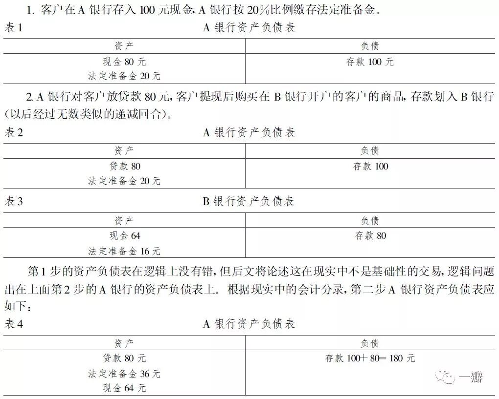 为填补漏洞, 货币银行理论创造出了“原始存款”的概念。但“原始存款”这个概念不但没有补掉漏洞, 反而产生了更大的漏洞。原始存款是从现金而来, 而现金又是从哪里来的? 现金最终来源当然只能是银行提取在中央银行的存款准备金。但货币银行理论囿于银行吸收存款发放贷款的理论, 只能坚持原始存款概念。货币银行理论关于货币创造的起始资产负债表也是不清楚的, 如果从最简单的假设推出的起始资产负债表指银行体系或社会上只有一个银行, 那么贷款应当是大于存款的, 进一步推导的结果也应当是贷款大于存款。但各类教科书的起始资产负债表和后面相应的推导都是存款大于贷款。