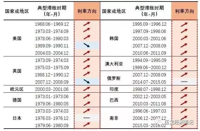 来源:WIND、CEIC,笔者整理 注:红、灰、蓝线分别表示利率上升、平稳和下降。