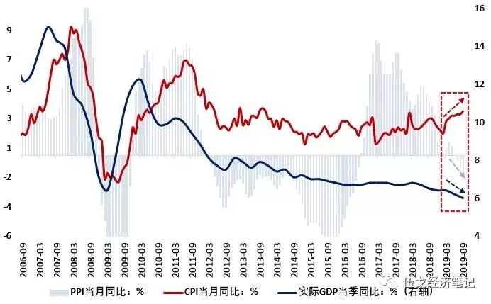 1 引言 近期我国GDP下探至6%的历史新低,但CPI升至3%的近六年高位。经济下行与物价高企共存的“滞胀”格局并非宏观经济的常态,其往往发生在成本冲击时期。其实,若排除猪肉因素,CPI的其他部分及PPI却大