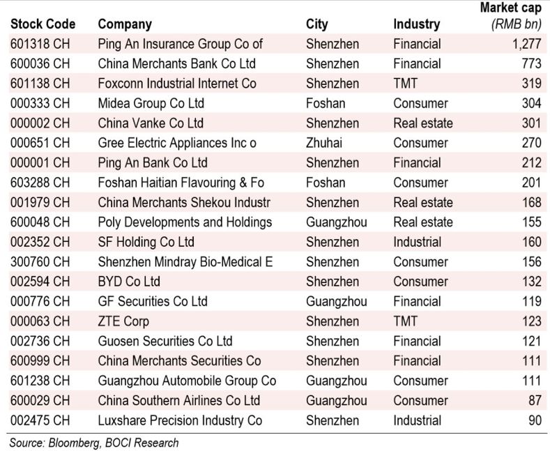 Figure 6 shows the top 20 A-share listed firms from the region. Again, Shenzhen firms dominate the table with a total number of 13, followed by Guangzhou’s 4 and Foshan’s 2. By industry, consumer products & services firms make up the most (7), followed by financials (6) and real estate (3).