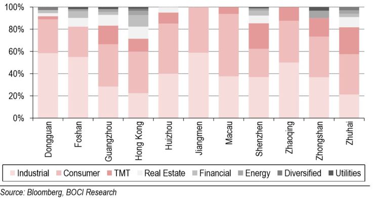 In the technology-eccentric TMT area, both Shenzhen and Zhuhai boast the highest percentage, demonstrating the significance of technology for their overall economies. Guangzhou, Zhongshan, HK and Zhaoqing also feature sizable percentages.
