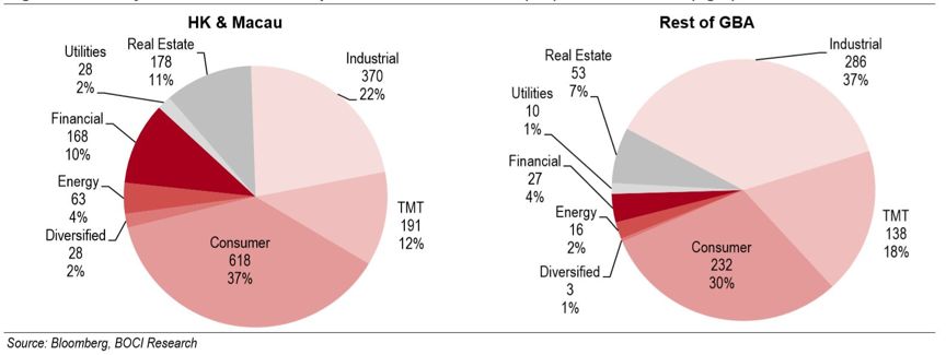 HK/Macau features consumer companies as the largest group of listed firms, followed by industrial companies. In comparison, Rest of GBA has industrial companies as the largest group of listed firms, followed by consumer companies.