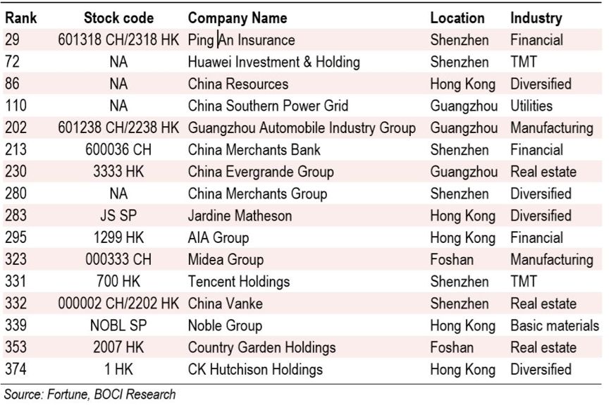 For the ranked firms from the GBA, Shenzhen features more companies in the list than other cities of the region. Besides, its ranked companies were also generally placed higher in the ranking table. Specifically, Shenzhen boasts a total of six firms, followed by five from HK, three from Guangzhou and two from Foshan. In fact, China Evergrande Group has moved its HQ from Guangzhou to Shenzhen recently (in August 2018), and China Resources has also recently built its mainland HQ in Shenzhen, both of which are expected to further boost Shenzhen’s total Fortune Global 500 count in the next ranking survey.