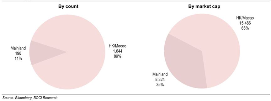 For the overseas listed firms from the GBA (including dual listed ones), Hong Kong/Macau registered companies dominate the table (see Figure 2). A majority of these HK/Macau registered firms are HK locally-brewed enterprises (about 1,263), as compared to about 411 firms with parents based in the mainland (mainland background). Although the locally registered HK/Macau firms account for 88% of the total listed stocks in number, they only make up 63% of the pool by market cap. Again, this demonstrates the average market cap of the mainland firms listed on the overseas exchanges (HK$42bn) is larger than that of the HK/Macau firms (HK$9bn).