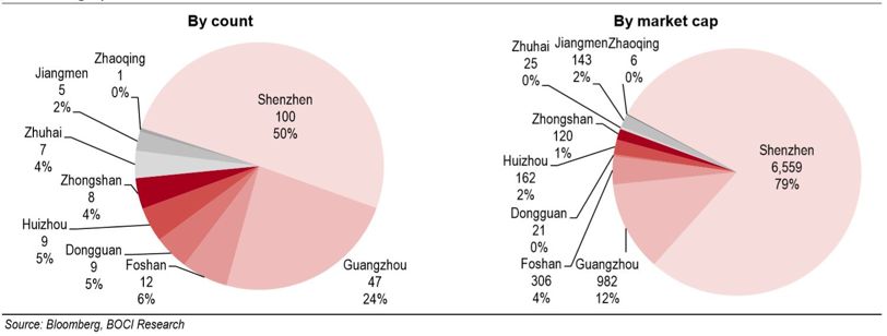 Among the overseas listed firms (including dual-listed ones), Hong Kong/Macau dominates the table at an 89% share in the total count but only 65% in the total market cap. When excluding the HK/Macau listed firms, Shenzhen again dominates the table with a 50% share in the total count, followed by Guangzhou (24%) and Foshan (6%), or 79% in the total market cap for Shenzhen, followed by Guangzhou (12%) and Foshan (4%).