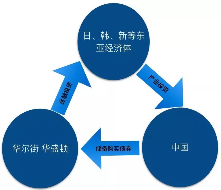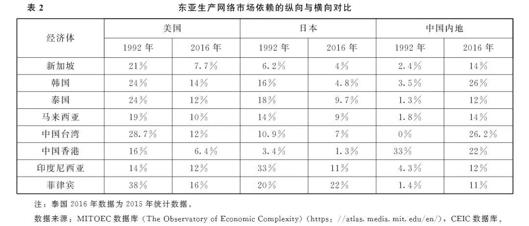 表1集中梳理了中国融入和重塑东亚生产网络的过程与影响。如表所示,1992年邓小平南方谈话之后,中国掀起一轮招商引资的高潮,尤其是1994年初人民币贬至8.7元/$之后,东亚华人制造业资本大幅流入中国以追求廉价的劳动力、土地和基础设施等生产要素,客观上导致泰国等四小虎未能像日本雁行模式设计的那样先于中国实现工业化。2001年的入世成功为中国制造业打开了全球市场,出口快速增长叠加欧美制造业资本加速流入中国,外资的溢出效应和产业聚集效应大大提升了中国制造业的效率。这也使得中国摆脱了日本主导的地区内垂直分工体系而直接与全球供应链产生互动和共生关系,导致日本的头雁效应消失,中国取而代之成为东亚生产网络的核心。2010年之后,由于人口年龄结构和青年受教育水平的快速变化,中国低端劳动力的供求关系出现了趋势性逆转,招工难取代就业难成为时代性现象。中国社会不再像过去数十年那样渴求外资加工制造业为其创造非农就业岗位,因而招商引资变成了招商选资,政府给予外资的超国民待遇被逐步取消,而对本土先进制造业予以重点扶持,进口替代与出口导向之间出现了微妙的“再平衡”。后金融危机时代,在继续吸引高端制造业对华转移的同时,中国开始主动出击在美、欧、日和以色列等地收购技术和企业,产业资本呈现双向流动局面。人民币开始摆脱美元之锚趋于独立浮动,地缘政治上中美战略博弈态势趋于上升,亚投行和“一带一路”倡议的推出形成了中美在全球层面上的外交竞争态势。中国的崛起最终对东亚生产网络形成系统性重构,动摇了美国对该地区经济、政治和军事主导性地位。东亚生产网络通过以下多个渠道帮助了中国的全方位崛起:首先,通过产业和社会改造让中国成为全球主要经济体之一。技术溢出效应和产业聚集效应大大提升了中国出口竞争力,并让人民币汇率保持强势。制造业的迁入也推动了工业化和城市化,创造了三亿以上的中产阶级和巨大的本土消费品市场,从而导致全球经济的东亚、北美和西欧三极结构逐步形成。其次,通过财政和技术贡献提升了中国的硬实力,制造业为中国政府贡献的巨大财政资源和外汇收入使得其国际地位和外交影响力大幅上升;两用技术的进步、研发投入的快速增长以及生产成本的快速降低,都大大提升了中国的军事能力。最后,制造业供应链本身也为中国带来权力。处于供应链上下游的国家之间存在不对称相互依赖的关系,传统的认识是上游控制下游,高端制约低端,但是由于中国一家几乎垄断了所有的下游,导致供应链的中上游各国反而对中国这个制造业总枢纽更加依赖。表2考察东亚各经济体对中国大陆市场的依赖程度及其横向(与美日对比)与纵向(与1992年对比)的比较。上表说明,即便是在日本经济的巅峰时刻,除了印度尼西亚之外东亚各经济体对美国市场的依赖远大于对日本的依赖。而到2016年,除菲律宾和泰国之外,其他经济体对中国市场的依赖都明显超过对美国和日本市场的依赖。当然,由于地区生产网络中加工贸易的作用,双边进出口额并不能完全准确反映供应链上的产业内和企业内贸易带来的依赖作用。但是按照肖雪等人利用制造业增加值数据的量化研究,2011年前后中国在东亚价值链中地位与日本不相上下。之后七年间中国与日本之间的差距迅速拉大,2019年东亚各经济体的确更加依赖中国大陆而不是日本。中国受惠于东亚生产网络和美国的市场需求,但中国并非搭便车者。由于美国的产业外包和中国的招商引资,以及东亚生产网络的升级和扩张,在美国、中国和其他东亚经济体之间形成了一个三角资本流动关系。如图2所示,美国以金融投资的方式将资本输出到东亚的日、韩、新以及中国的台、港、澳等经济体,后者的制造业又被中国的招商引资政策提供的各种补贴和优惠政策吸引到中国大陆,以外商直接投资形式牟取高收益。外资带来的资本金和贸易盈余被汇聚到中国外汇管理局,后者以储备投资的方式配置了巨量美国国债和金融债,压低了美国的利率。在这个三角资本循环中,中国主动承担着巨额福利损失,主要表现为外资在华的高收益与中国外储在美元债券中的低收益之间的巨大利息差,经济学家们普遍认为每年损失达数千亿美元。这笔福利损失其实可以看作中国借力美国主导的全球化和东亚生产网络所支付的昂贵代价,中国用全民分担的福利损失来换取宝贵的工业化机会。后金融危机时代,无论是奥巴马还是特朗普,美国政府反复指责中国是搭便车者,这种说法显然是不公平的。中国的确是美国驾驶的全球化班车上的最主要乘客,中国的工业化的确离不开美国的消费和东亚生产网络的“摆渡”,但是中国是支付了昂贵的车票的。中国的成功更不是被动地依赖东亚制造业生产网络的带动作用,而是积极发挥自身政策能动性的结果。中国相对于东亚邻国和其他发展中国家拥有很大的制度优势和规模优势。从制度上来看,与自由主义经济学传播的观念相反,强政府在产业发展中历来扮演着关键作用,而中国的政治经济体制融合了美苏两个超级大国的优势基因,既有苏联体系的强国家特征和资源动员能力,又有美国式市场经济的开放性和自适应性,所以相对于东亚生产网络上的其他经济体表现出明显的竞争优势。从规模上看,中国既有需求的