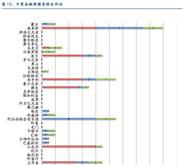 综合国家合作、金融机构布局和金融产品三方面因素,区域层面,东南亚地区中资金融便捷度较高;国别层面,俄罗斯、新加坡、阿拉伯联合酋长国、匈牙利、马来西亚五国中资金融便捷度较高。